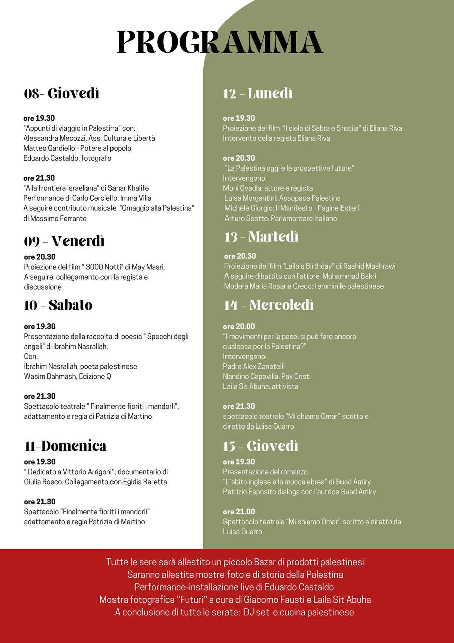 O.S. Innanzitutto il teatro. Quest’anno non siamo riusciti a coinvolgere tutti gli amici che volevamo, ma mi auguro, visto che già esistono accordi precisi, che in una seconda edizione potremo reclutare tutti gli altri. L’obiettivo è quello di coinvolgere amici italiani che fanno teatro o narrazione sulla questione palestinese e ci sono molti lavori che meritano attenzione. Il teatro è sicuramente il percorso più importante su cui vorremmo puntare. Presentiamo un paio di spettacoli nostri: “Mi chiamo Omar” scritto e diretto da Luisa Guarro, “Finalmente fioriti i mandorli” adattamento e regia di Patrizia Di Martino. Poi la performance di Carlo Cerciello con Imma Villa, “Alla frontiera israeliana” di Kalife, che è tratta dallo spettacolo “Il cielo di Palestina” a cui ho avuto l’onore di partecipare come attore nel 2016.