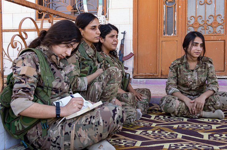 In Rojava abbiamo incontrato queste combattenti, abbiamo parlato con loro, in una base di addestramento, dove per ragioni di sicurezza siamo venuti a conoscenza del luogo solo qualche ora prima. Una base in mezzo alla campagna dove vivono e si addestrano. Nelle stanze sono appese immagini di Ocalan e delle combattenti uccise durante la guerra contro lo stato islamico.