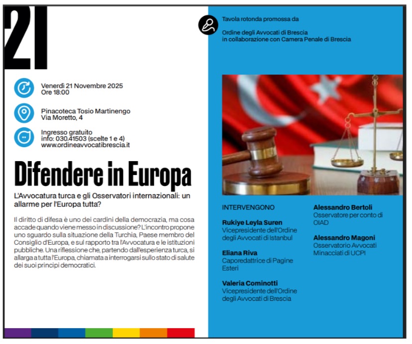 L’Ordine degli Avvocati di Brescia e la Camera Penale promuovono una tavola rotonda dedicata alla crisi dello stato di diritto in Turchia, mercoledì 21 novembre alle 18 nella Pinacoteca Tosio Martinengo. L’iniziativa, inserita nel Festival della Pace e aperta alla cittadinanza, porta a Brescia la vice-presidente dell’Ordine degli Avvocati di Istanbul, Rukiye Leyla Suren, che offrirà un quadro della progressiva erosione del diritto di difesa nel Paese membro del Consiglio d’Europa.