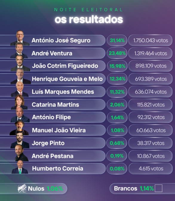 Al primo turno, in realtà, l’ha spuntata l’ex ministro ed ex segretario del Partito Socialista, António José Seguro, che ha portato a casa il 31,1% dei voti. Dietro di lui si è piazzato André Ventura, leader del partito di estrema destra “Chega!”, che ha ottenuto il 23,5%.