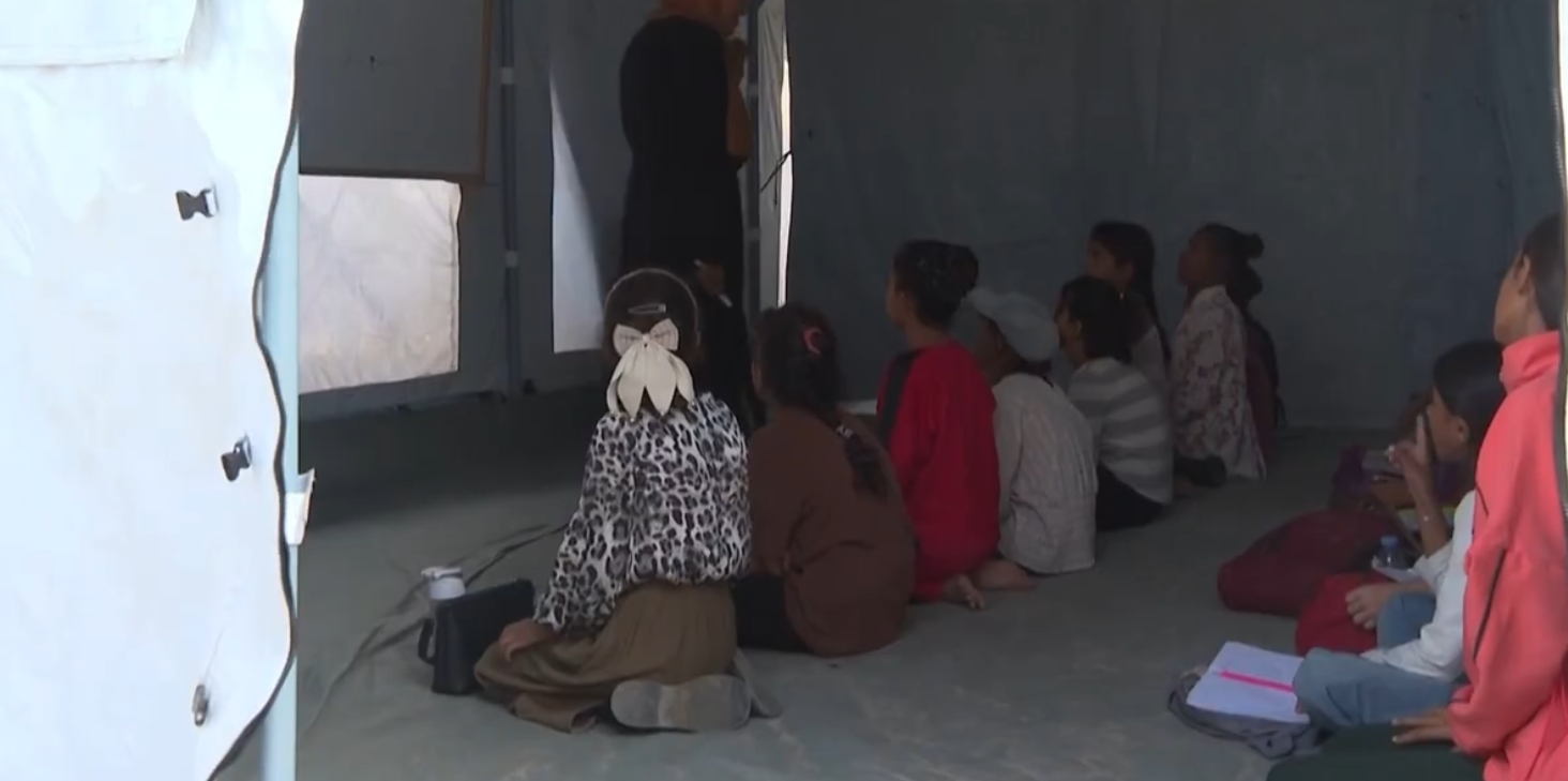 Nibal Abu Armana è seduta nella sua tenda, dove insegna a Mohammed, il figlio di sette anni, nozioni di base di alfabetizzazione e matematica. Nibal, 38 anni, madre di sei figli, è costretta a fare affidamento sulla fioca luce di una lampada LED a batteria. Dopo due ore, gli occhi di Nibal e Mohammed sono esausti.