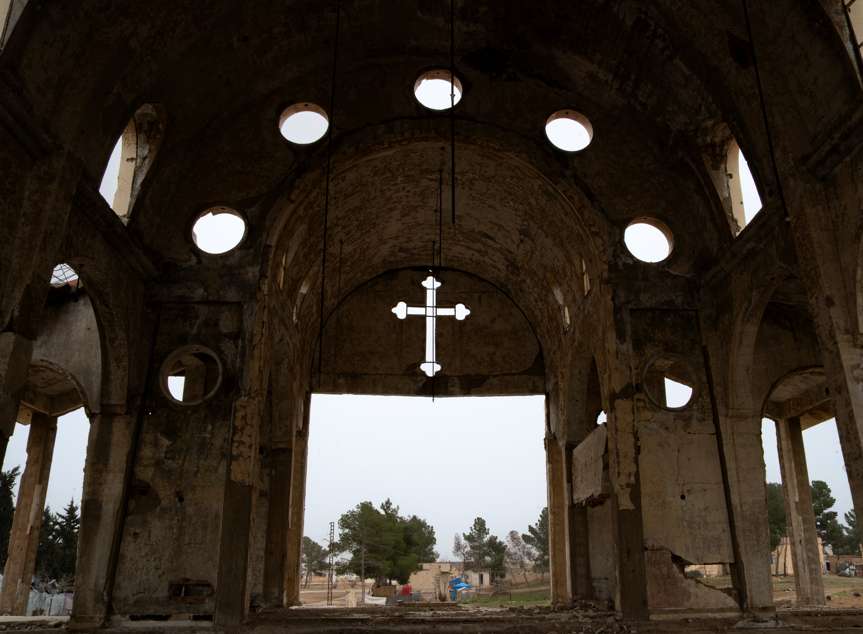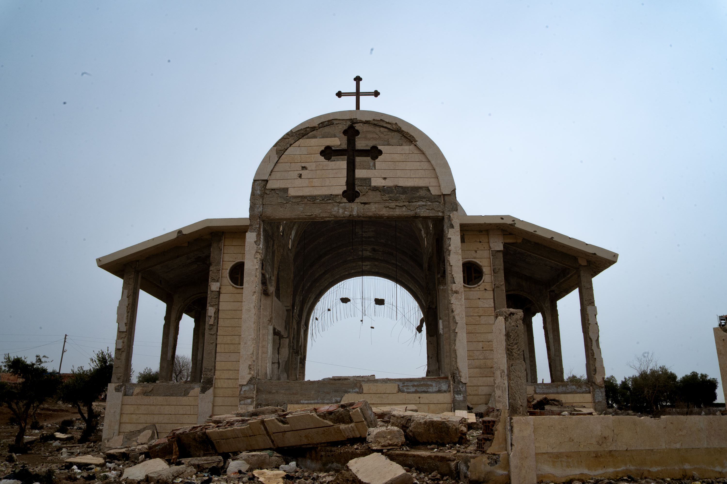 Il villaggio era già stato segnato dalla guerra: nel 2015 fu occupato dall’ISIS per circa sei mesi, prima che la coalizione a guida statunitense bombardasse la zona. Durante l’occupazione, la chiesa al centro del paese fu distrutta e oggi ne rimane soltanto lo scheletro. Sui muri, all’interno delle case, si vedono ancora scritte e murales inneggianti allo Stato Islamico, come se il passato faticasse ad abbandonare questi luoghi.