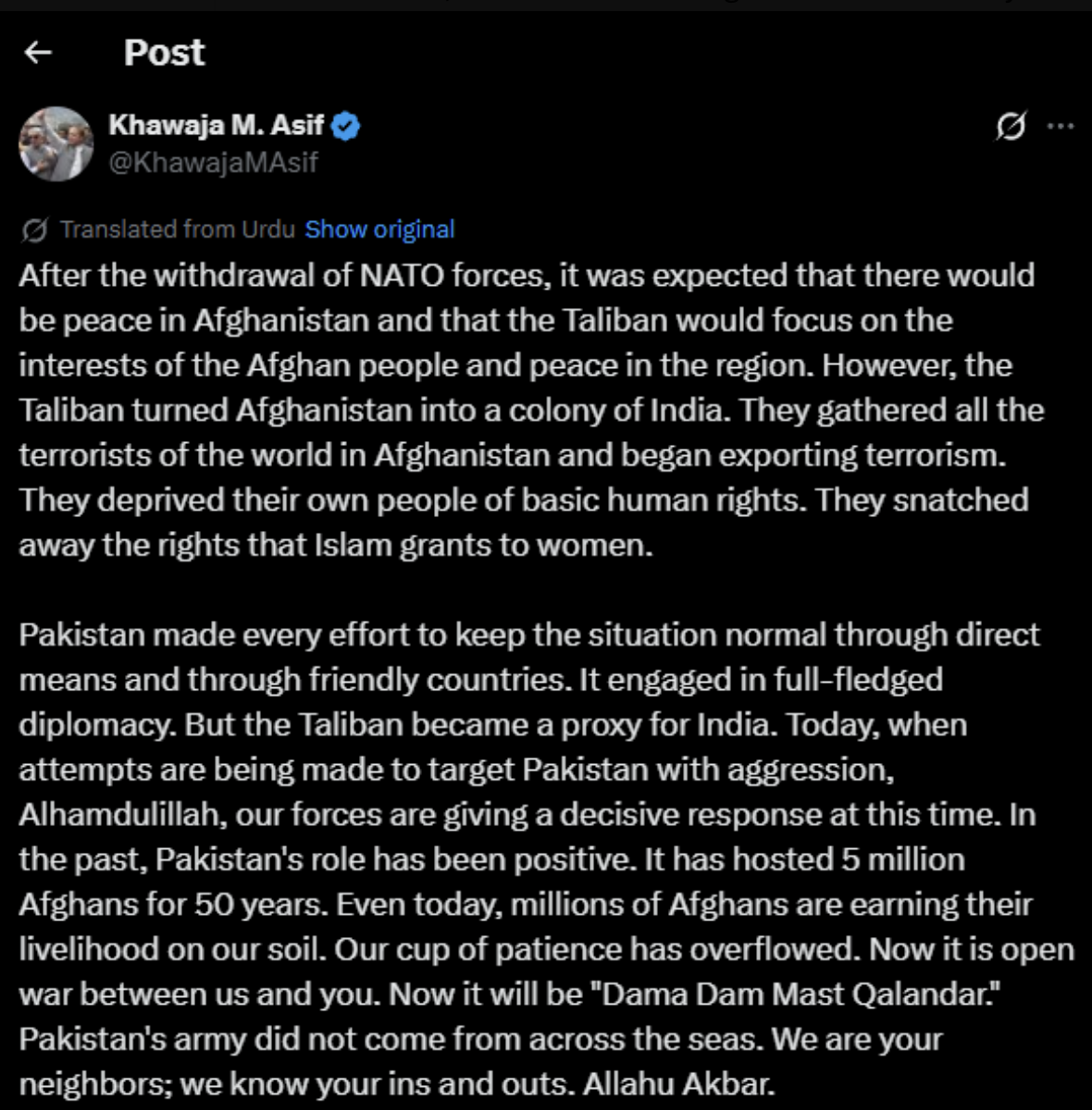Il ministro Asif ha aggiunto di aver sperato che il governo talebano avrebbe portato stabilità nella regione, dopo il ritiro delle truppe Nato, e che al contrario l’Afghanistan in questi anni si è fatto rifugio per terroristi da tutto il mondo ed “esportatore di terrorismo”. Un’accusa che non lascia più spiragli per il dialogo con il governo di Kabul, da tempo criticato da Islamabad di non agire per contrastare le formazioni terroristiche attive sul territorio pakistano con frequenti attacchi suicidari. Le loro basi, secondo il Pakistan, si troverebbero in Afghanistan.