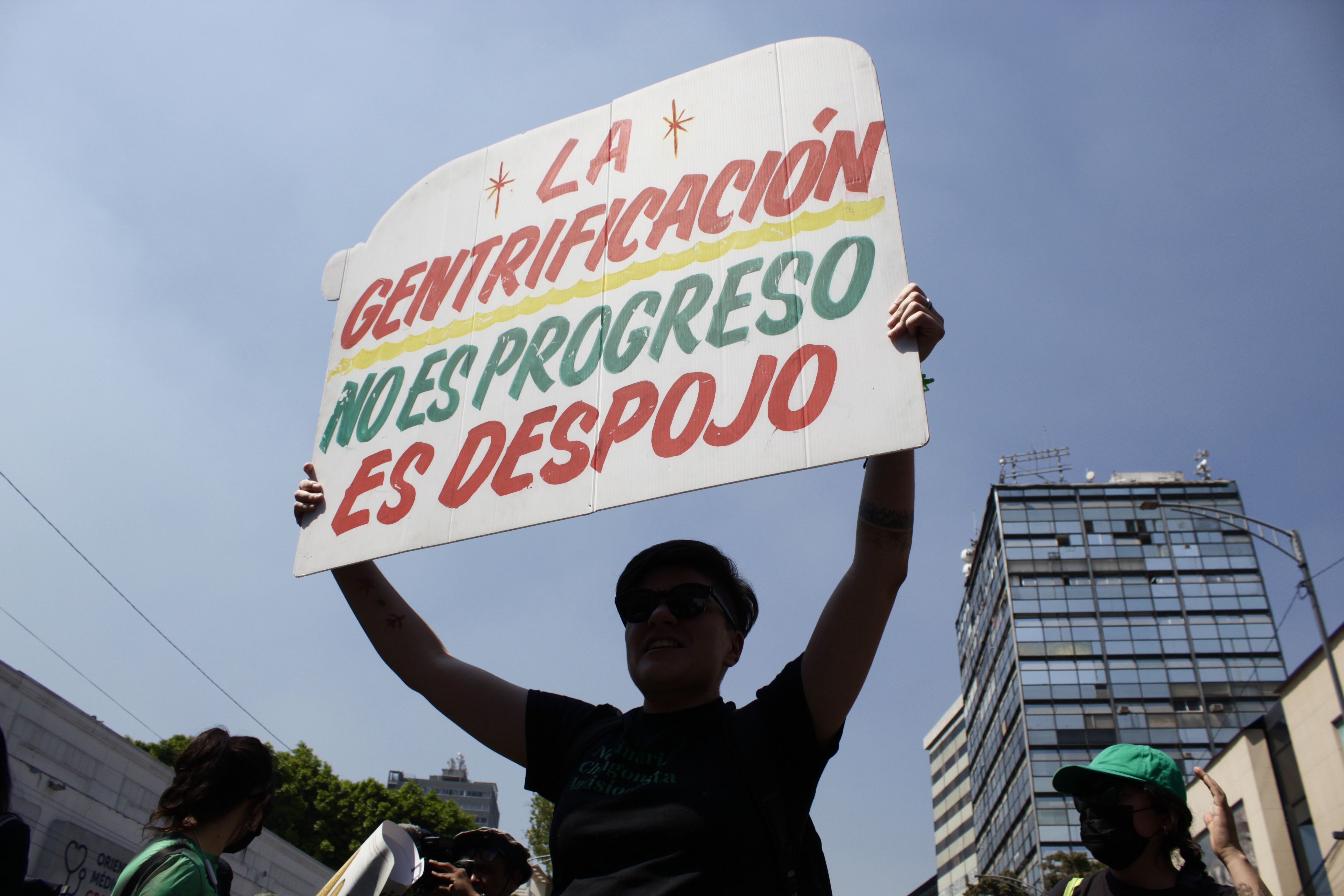 Manifestante durante la marcia del 27 febbraio 2026, Città del Messico. Il cartello recita: “La gentrificazione non è progresso, è espropriazione”. (Sofia Pontiroli)