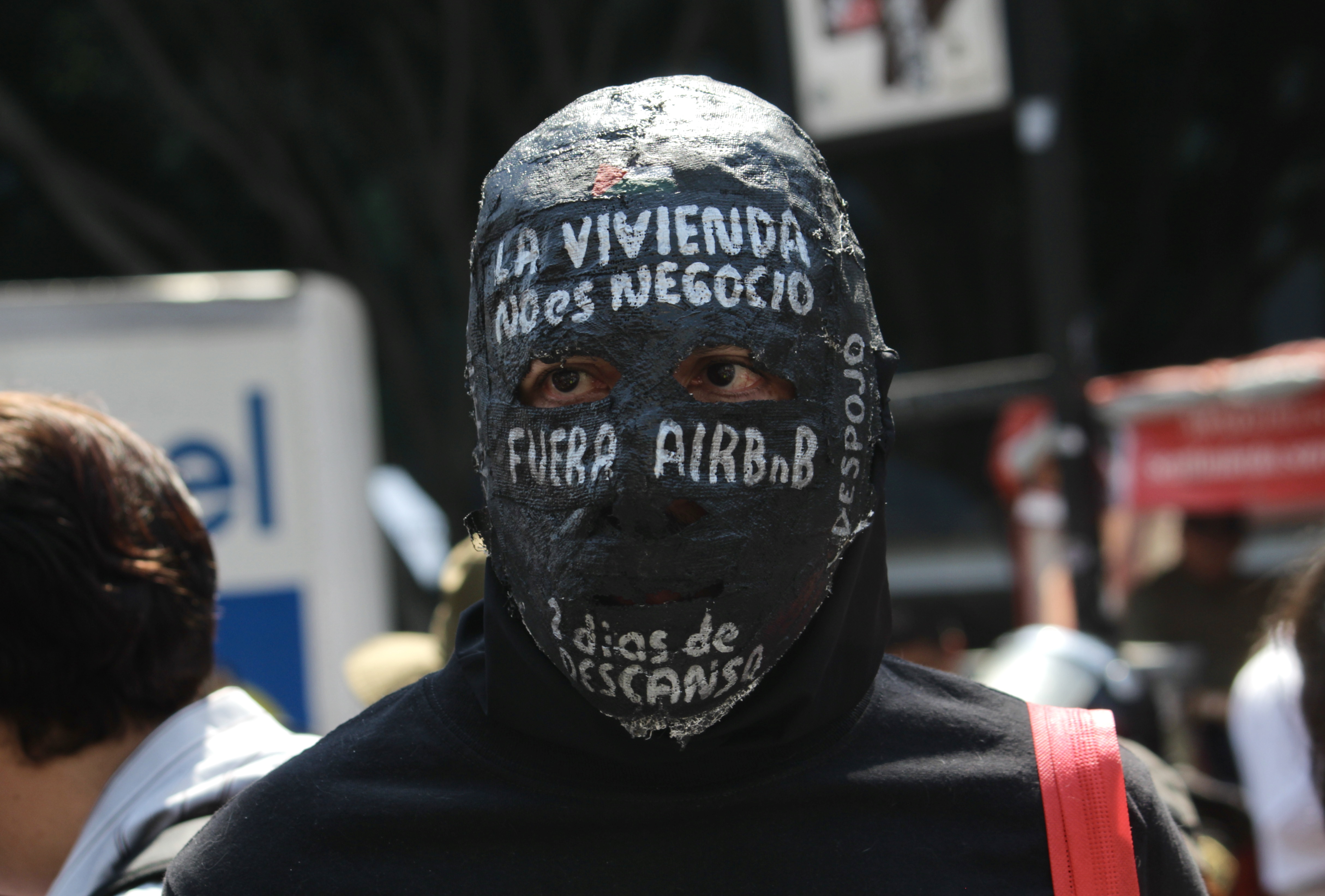 Manifestante durante la marcia del 27 febbraio 2026, Città del Messico. Sulla maschera si legge: “La casa non è un business” e “Fuori Airbnb”. (Sofia Pontiroli)