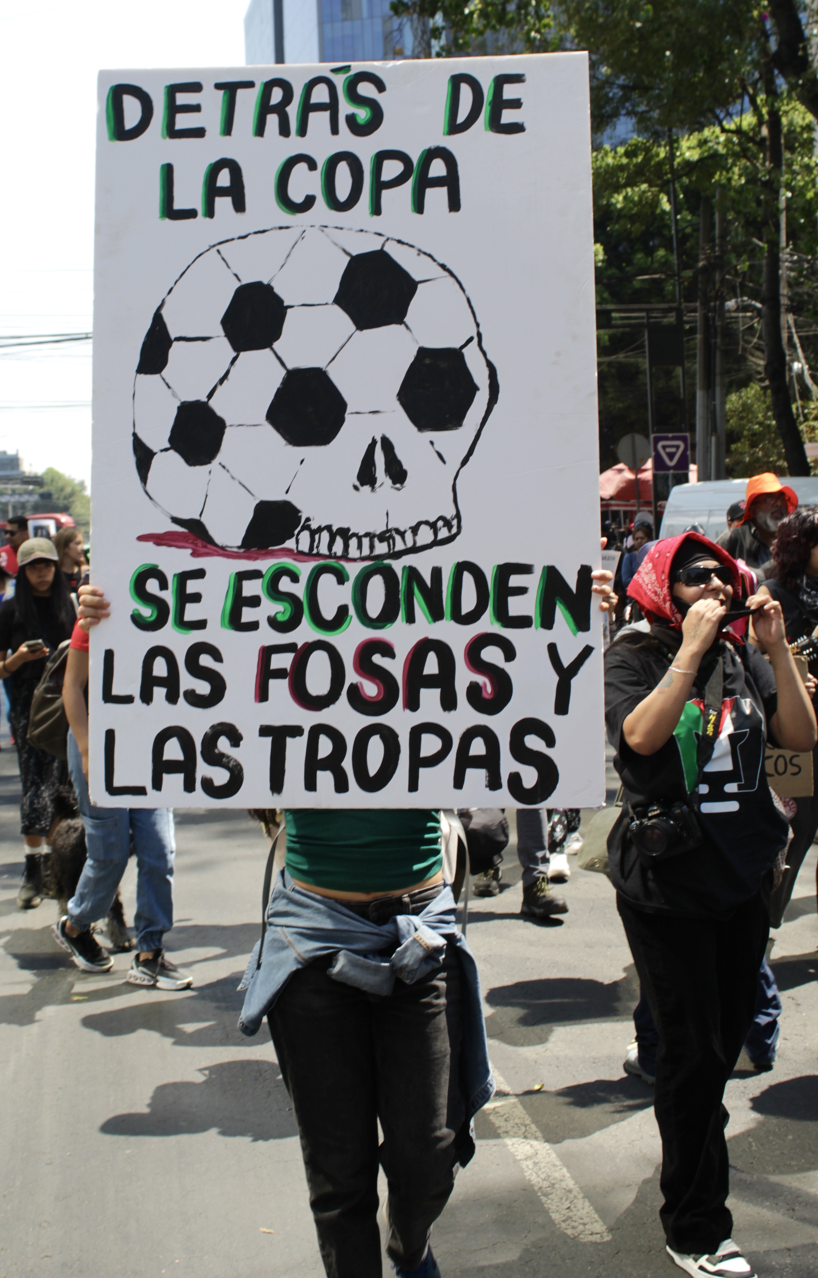 Manifestante durante la marcia del 27 febbraio 2026, Città del Messico. Sul cartello si legge: “Dietro la Coppa si nascondono fosse e truppe”. (Sofia Pontiroli)