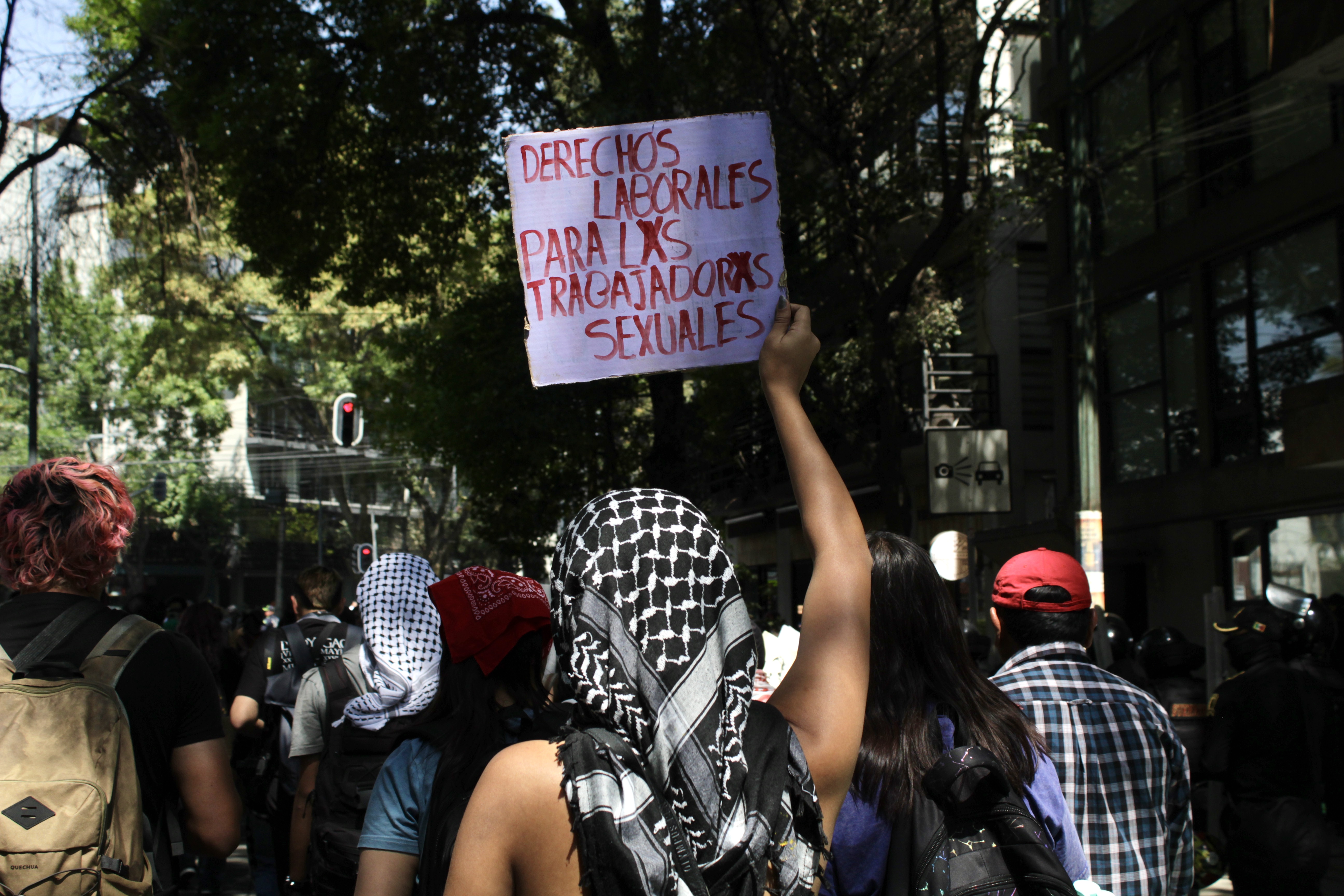 Manifestante durante la marcia del 27 febbraio 2026, Città del Messico. Il cartello recita: “Diritti sul lavoro per le lavoratrici sessuali” (Sofia Pontiroli)